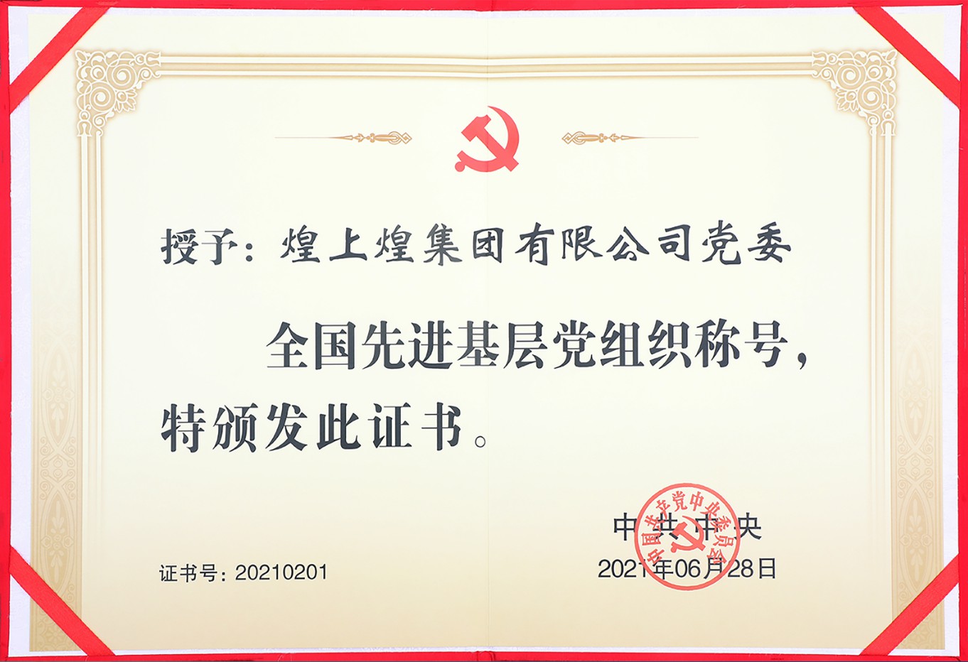 2021年,煌上煌集團黨委被中共中央授予“全國先進基層黨組織”榮譽稱號。