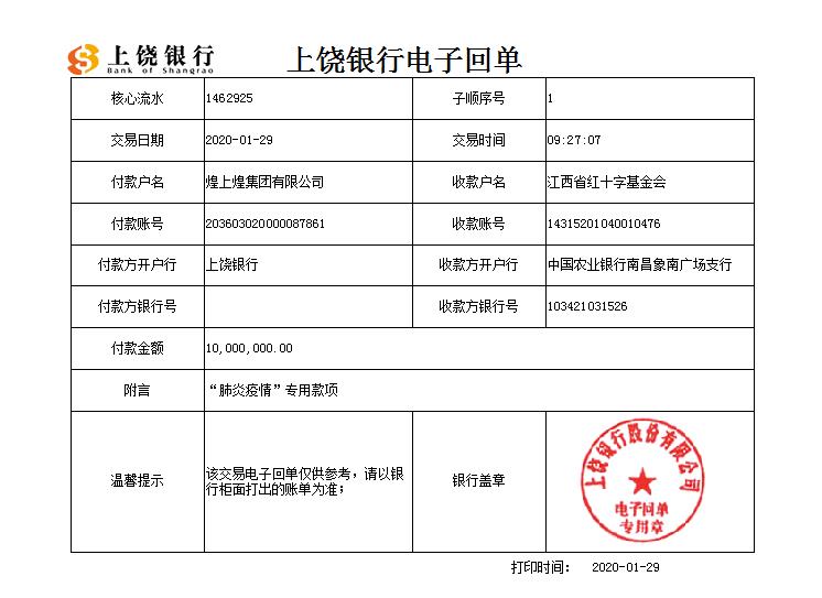 這個春節,席卷而來的新型冠狀病毒肺炎疫情牽動著全國人民的心。越是困難時期,企業越要承擔社會責任自疫情爆發以來,煌上煌集團在做好自身防疫措施的同時,緊急啟動抗擊疫情愛心捐款行動。1月29日,在集團董事局主席徐桂芬、集團黨委書記兼總裁褚建庚、股份公司董事長兼總經理褚浚的部署安排下,公司決定通過江西省紅十字基金會捐款人民幣1000萬元現金,全力支持抗擊新型冠狀病毒感染的肺炎疫情防控工作。